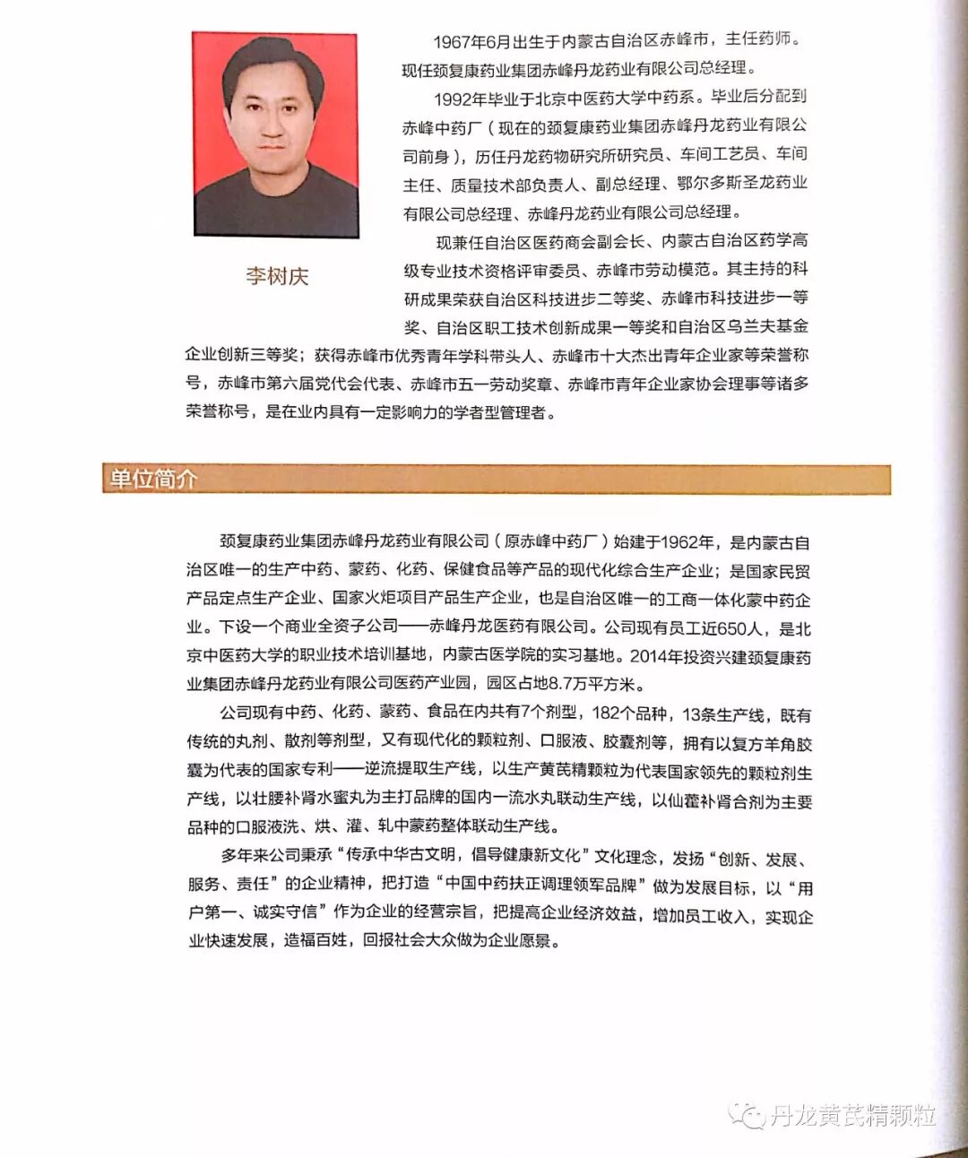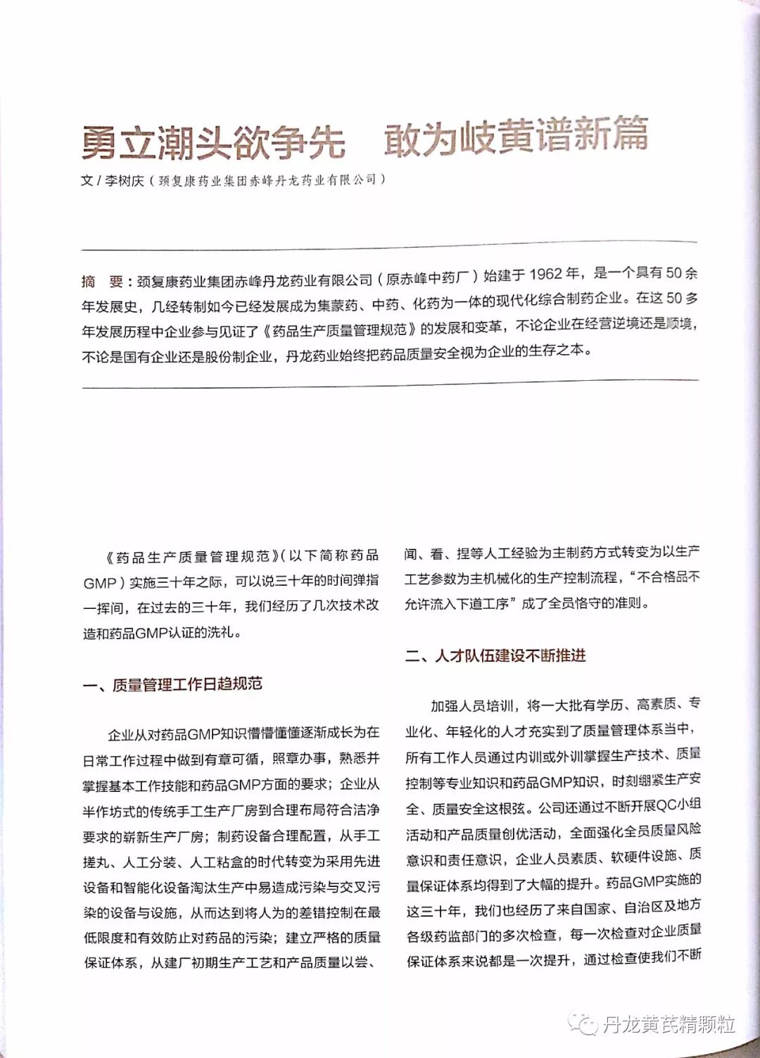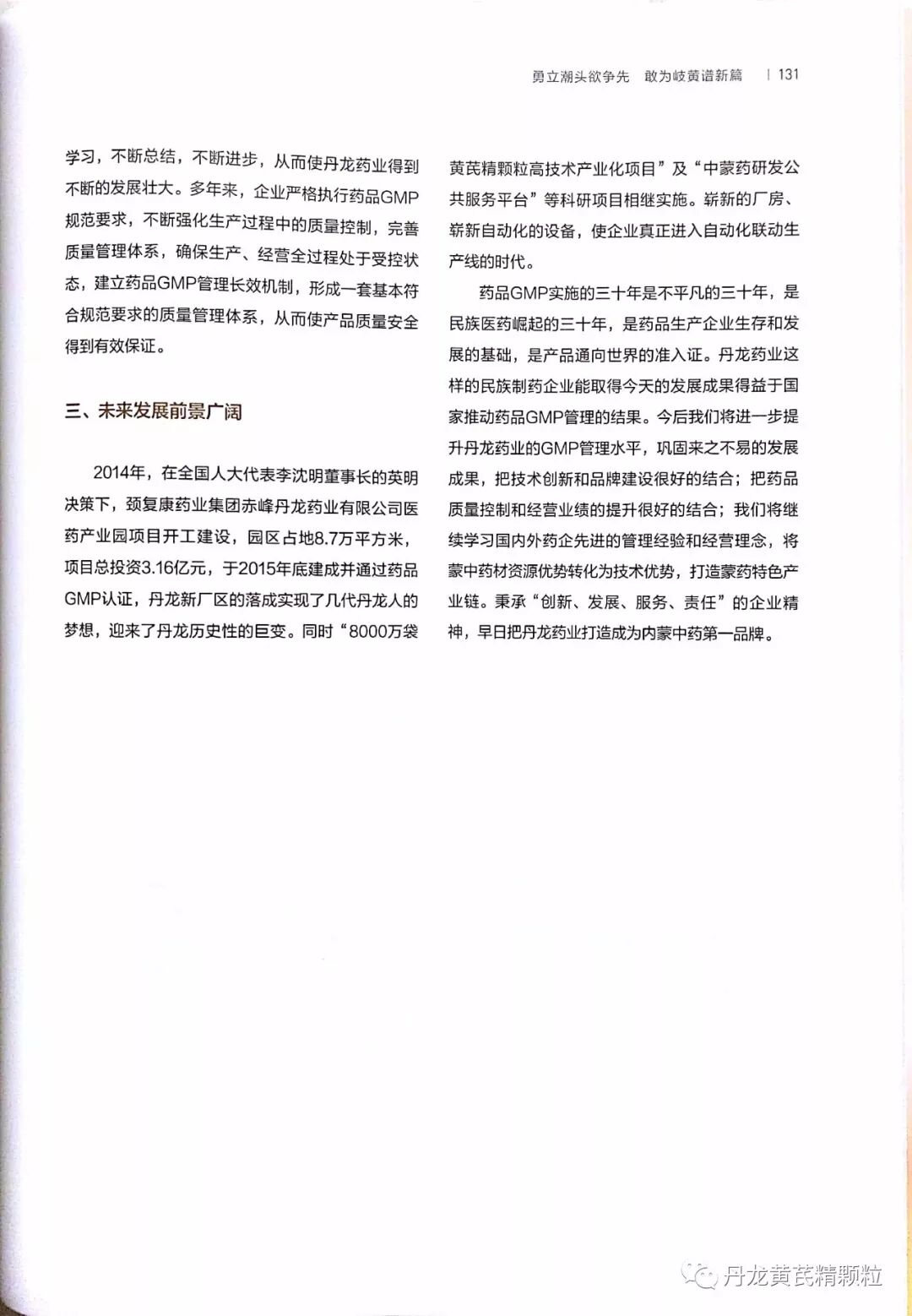赤峰丹龙药业有限公司做为自治区唯一家制药企业代表,受邀参与了本书的撰写工作。公司党委书记、总经理李树庆以《勇立潮头欲争行,敢为岐黄谱新篇》为题,通过回顾丹龙药业56年从小到大、从弱到强的发展历程,见证了药品GMP实施30年为我国制药企业带来的翻天覆地的巨变。